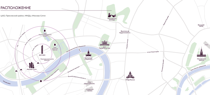 ЖК удачно интегрирован в кластер башен Сити, находясь рядом со всей инфраструктурой башен, но при этом оставаясь в тишине и на удаленности от суеты офисной жизни. В 7-ми минутах парк Красная Пресня, а любители долгих пеших прогулок могут за полчаса дойти до Московского зоопарка. Расположение на первой линии Красногвардейского проезда позволяет быстро выехать на ТТК или Кутузовский проспект, напрямую пройти к Пресненской и Краснопресненской набережным. До Садового кольца и Звенигородского шоссе всего 3,5 километра.