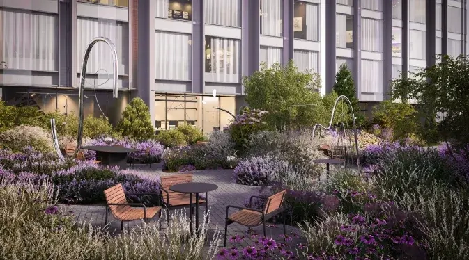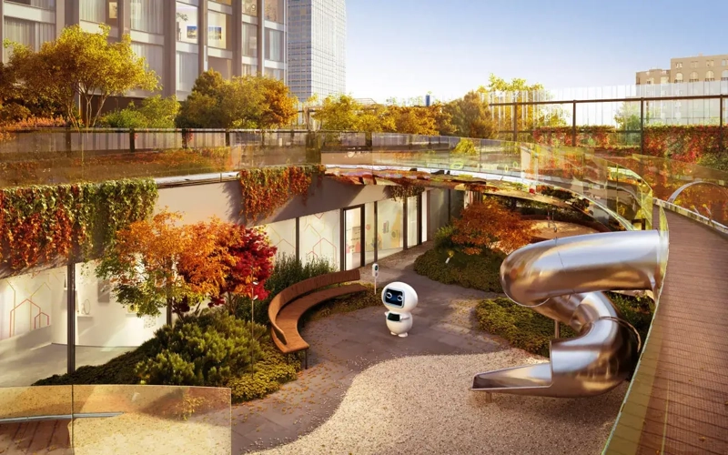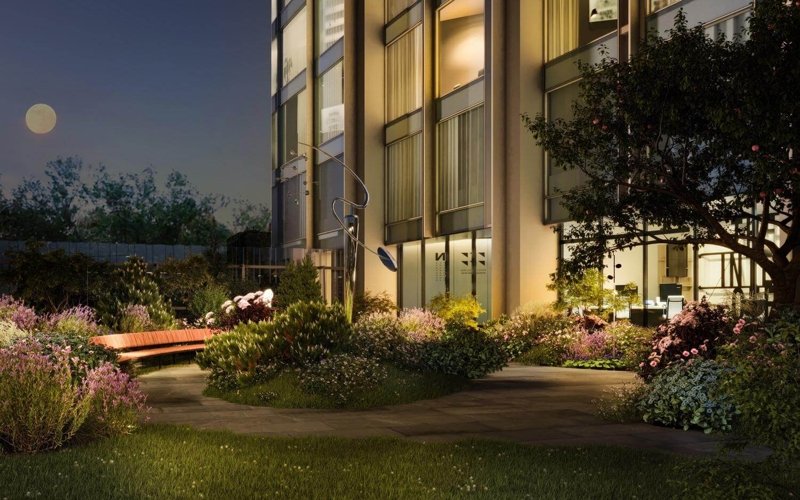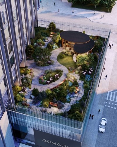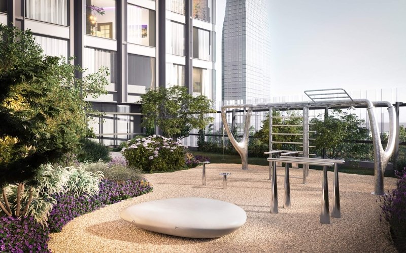 В стилобате разместят кофе и рестораны, химчистку, супермаркет, винотеку, коворкинг, SPA и beauty салоны, на его кровле разобьют закрытый от посторонних секретный сад, а с другой стороны башни выделят тихий уголок для йоги и медитации. Чуть ниже, на террасе второго этажа, на игровой площадке смогут повеселиться малыши.