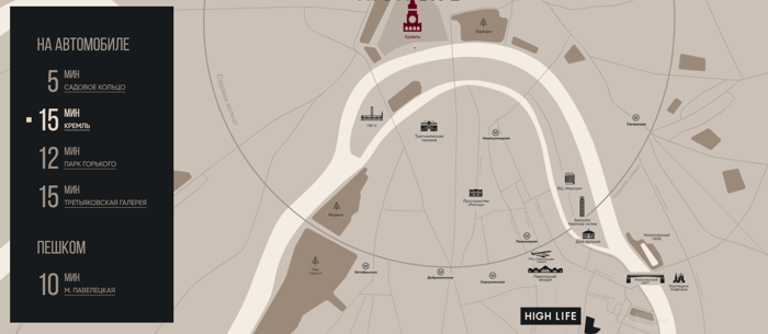 Квартал небоскребов HIGH LIFE расположен вблизи исторического Замоскворечья, всего в 5 минутах до центра столицы. Метро «Павелецкая» расположено в 10 минутах ходьбы. Замоскворечье знаменито своей гастрономической инфраструктурой. Вблизи находится торговый комплекс "Павелецкая плаза", Дом музыки, множество магазинов, фитнес-клубы и салоны красоты, а за 15 минут можно доехать до Третьяковской галереи и Парка Горького.