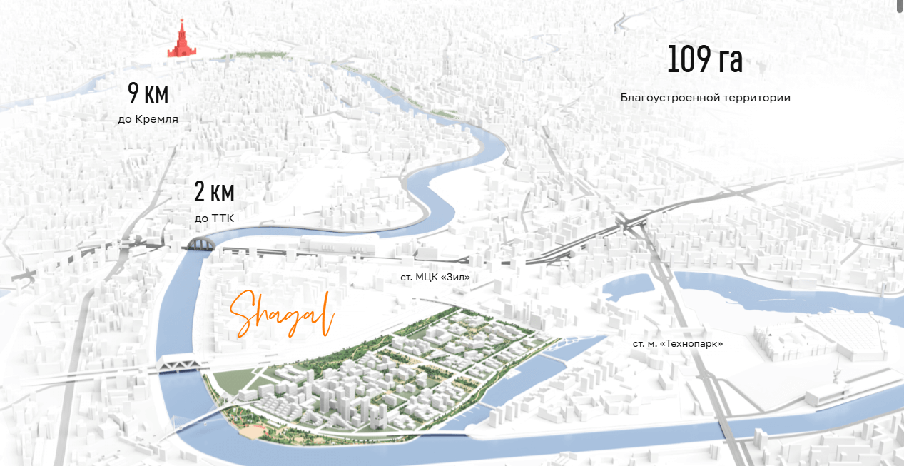 Новый проект расположен в Даниловском районе в пяти минутах пешей прогулки от набережной Марка Шагала. Отличную транспортную доступность обеспечивает прямой выезд на Третье транспортное кольцо (ТТК), развитая сеть общественного транспорта, в том числе две станции метро, станции МЦК, речной транспорт и даже канатная дорога.