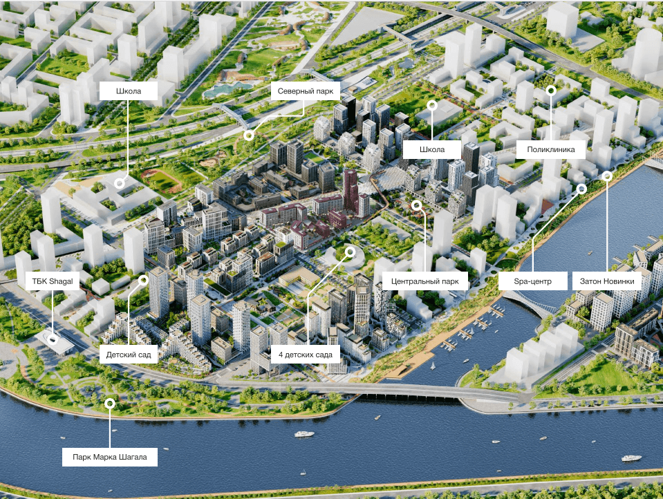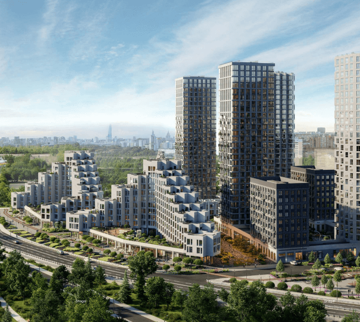 Одним из главных особенностей жилого квартала Shagal станет соседство разных типологий застройки и форматов жилья, которые никогда не пересекались в рамках одного района в Москве — от таунхаусов до небоскребов. У воды стоят высокие башни, из которых открывается красивый вид на Москву-реку. Возле парка расположились малоэтажные урбан-виллы с зелеными внутренними дворами