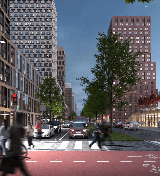 Разноформатная транспортная сеть района и безопасный скоростной режим создают комфортные условия для перемещений любым другим способом: на автобусе, на машине, на велосипеде. Главной особенностью жилого квартала является соседство разных типологий застройки и форматов жилья — от таунхаусов до небоскребов.