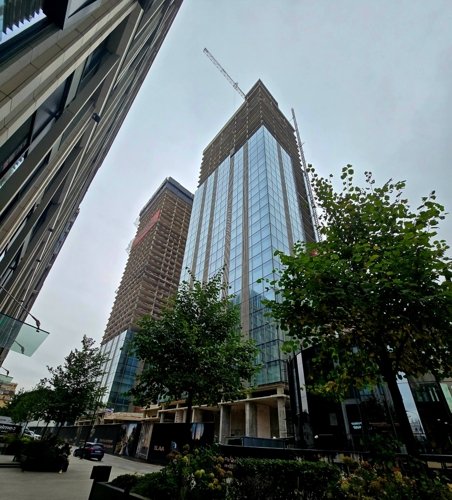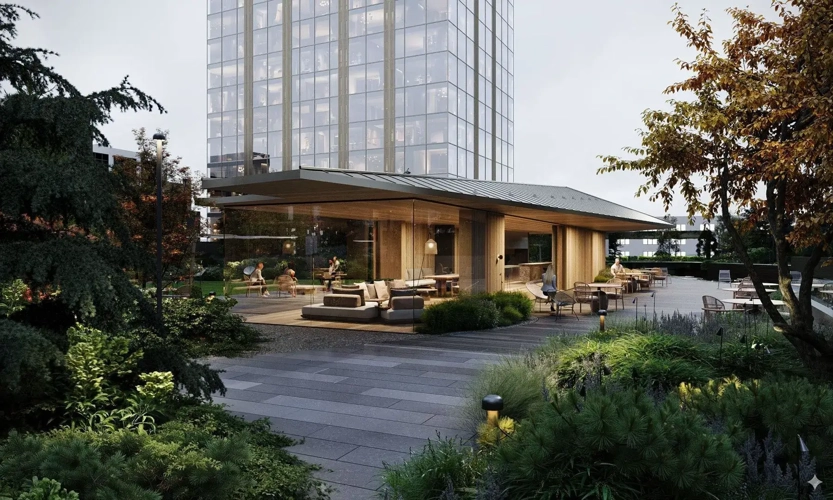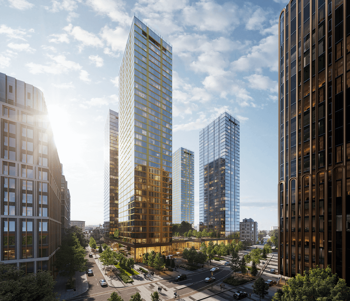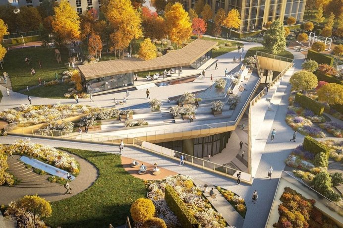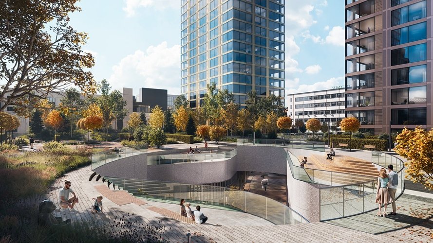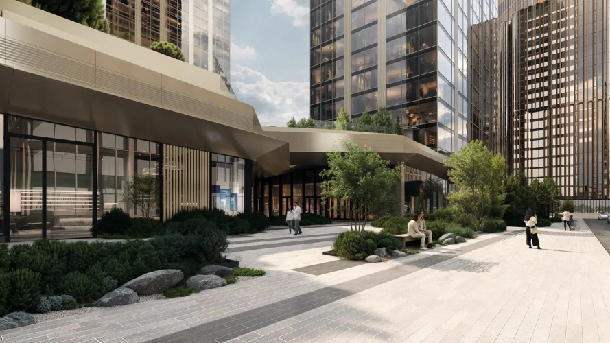 Общественное пространство стилобата становится точкой притяжения для всего района. Оно объединяет корпуса второй очереди SLAVA и работает как открытая городская платформа.