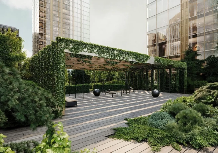 На крыше стилобата расположен приватный двор-сад, площадью около 7700 м². Здесь высажены десятки видов деревьев, кустарников, многолетних цветов и трав - от берез и сирени до тюльпанов, крокусов, нарциссов и японской спиреи.