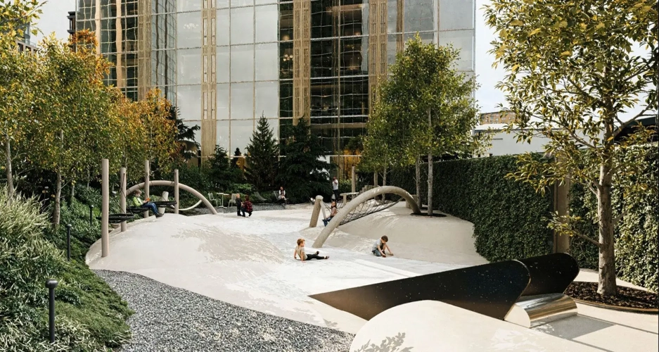Функциональные зоны: амфитеатр со стекающими фонтанами, зоны отдыха, площадка для воркаута, лес-сквер для прогулок, открытая терраса для занятий йогой и солнечных ванн, детские игровые зоны для разных возрастов, павильон для защиты от дождя и прямых солнечных лучей, отдельная игровая зона для собак, зона с шезлонгами, площадка для йоги.