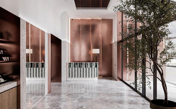 «Дизайнерская концепция представляет собой современную интерпретацию классики: сдержанная элегантность, минимализм в деталях, выразительные фактуры и контрастные цветовые сочетания». Oleg Klodt, автор дизайна общественных пространств.