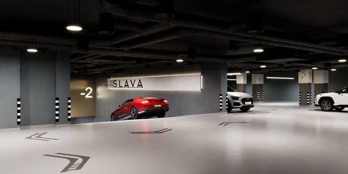 Во второй очереди премиального комплекса SLAVA предусмотрен двухуровневый подземный паркинг на 778 машиномест. Резиденты могут установить зарядные устройства для электромобилей. На паркинге предусмотрена круглосуточная очистка воздуха и система подкачки шин, велопарковка (только для резидентов), усиление сотовой связи, автомойка, кладовые от 3 до 10 м²